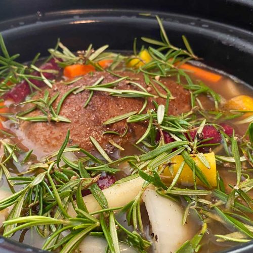 Place the venison and garlic in the slowcooker with the apple, onion, carrots, and potatoes. Cover with beef broth. Set to boil. Then, turn to Low Simmer. Add the spices and stir.